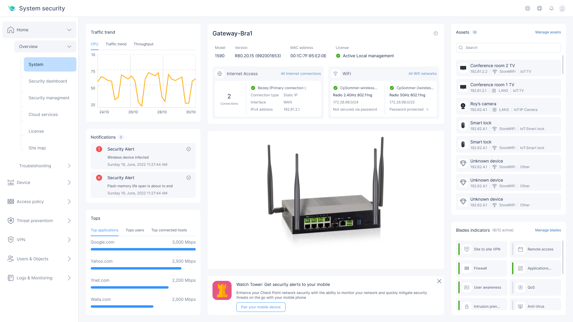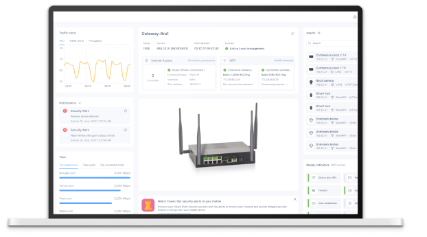 Grouped data by function (alerts, WiFi, assets, traffic, etc.) using modular cards and sections.Low-Quality Data Visualization- Simplified, Labeled Graphs