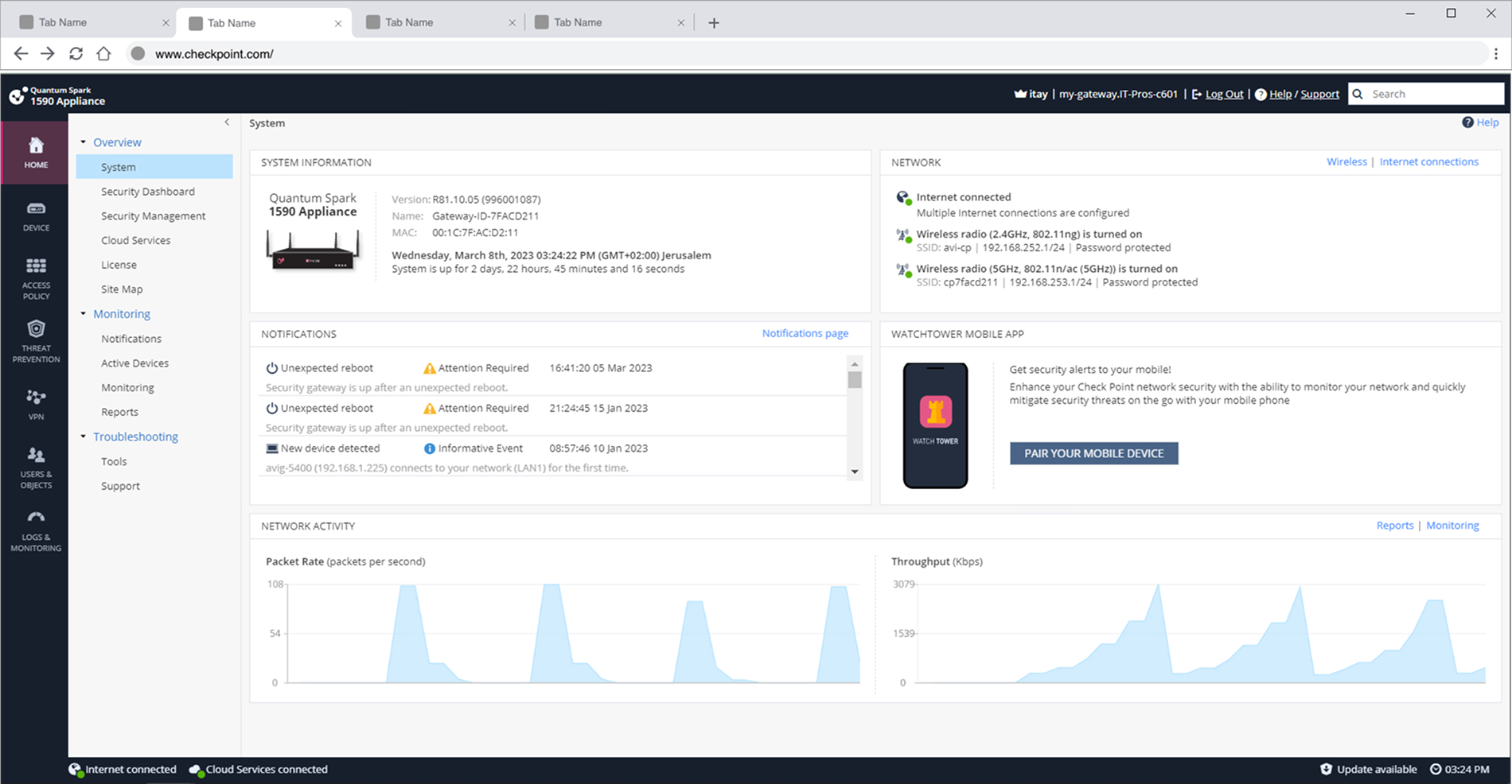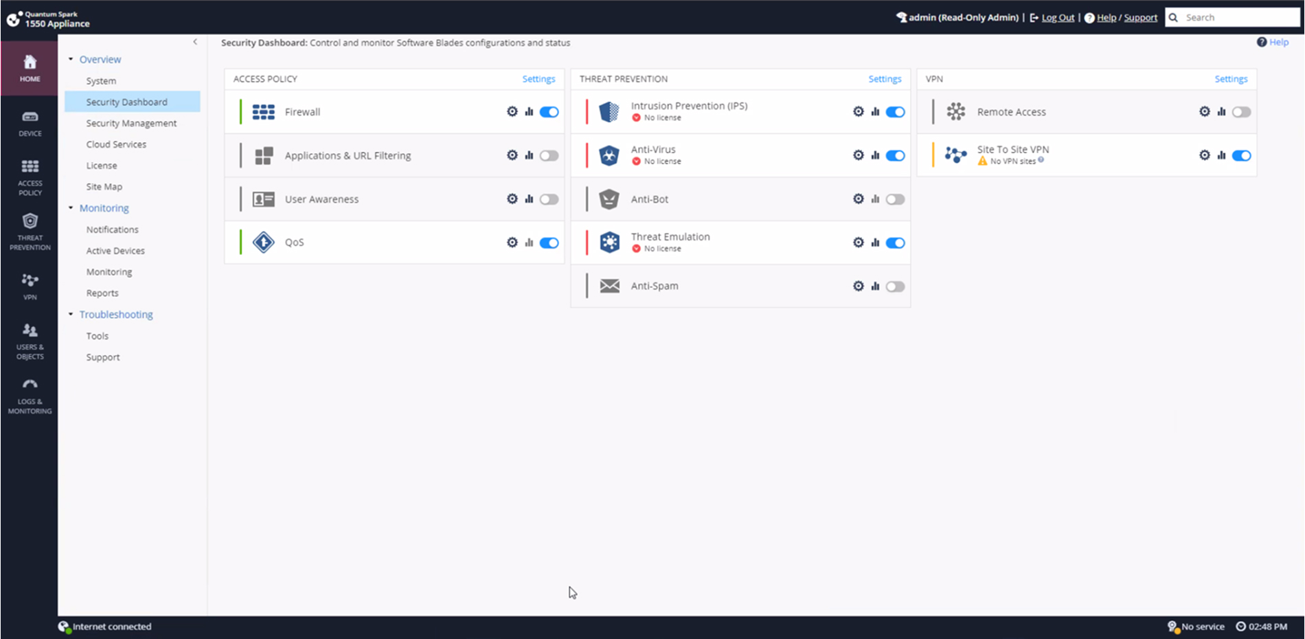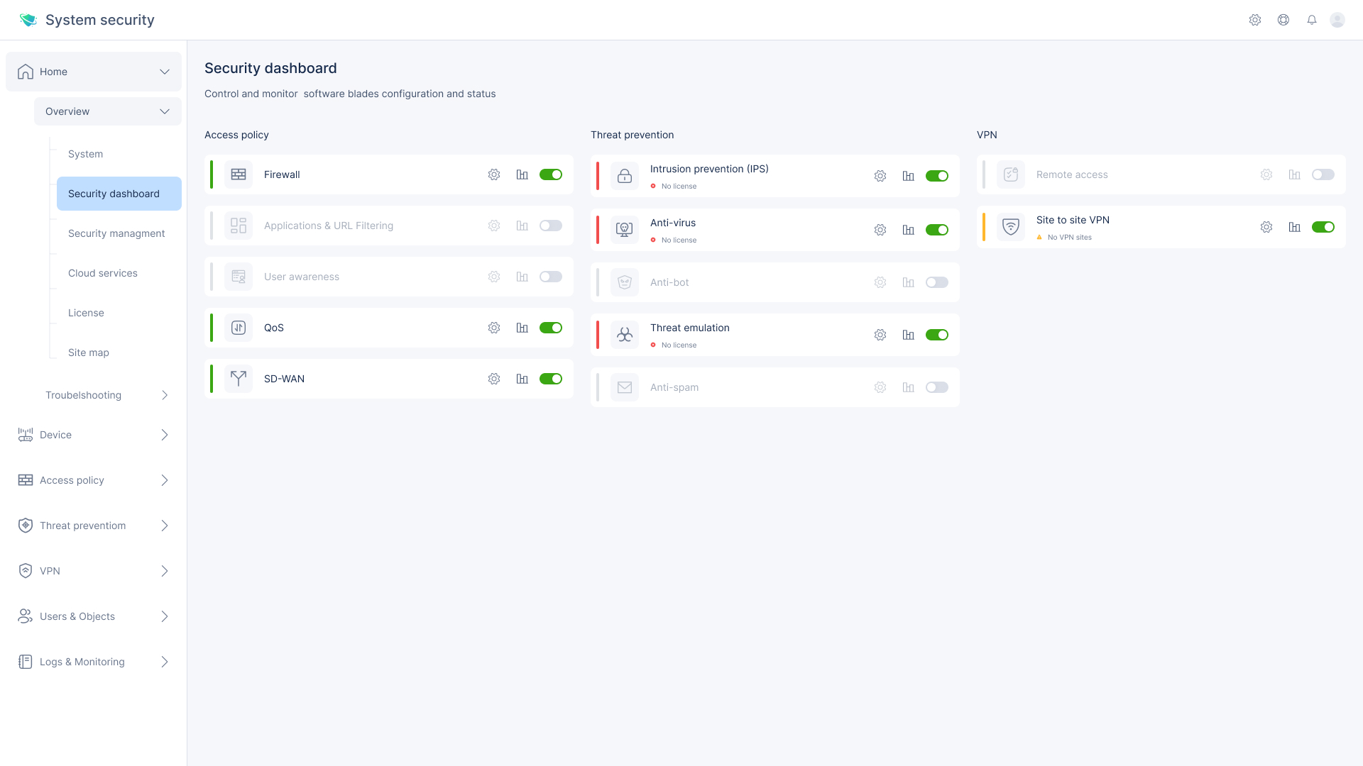 Flat structure – All software blades looked similar, with no visual separation between categories (Access Policy, Threat Prevention, VPN).