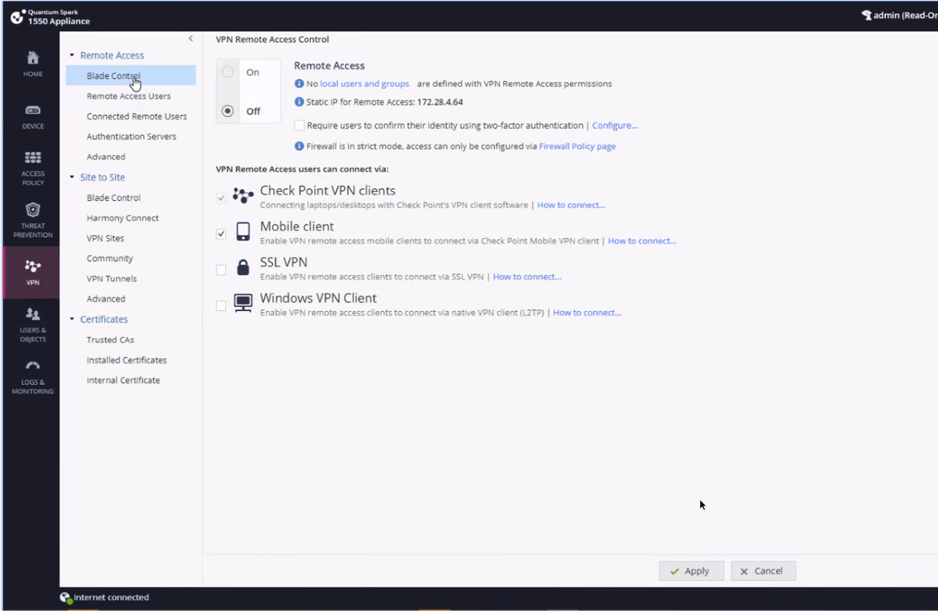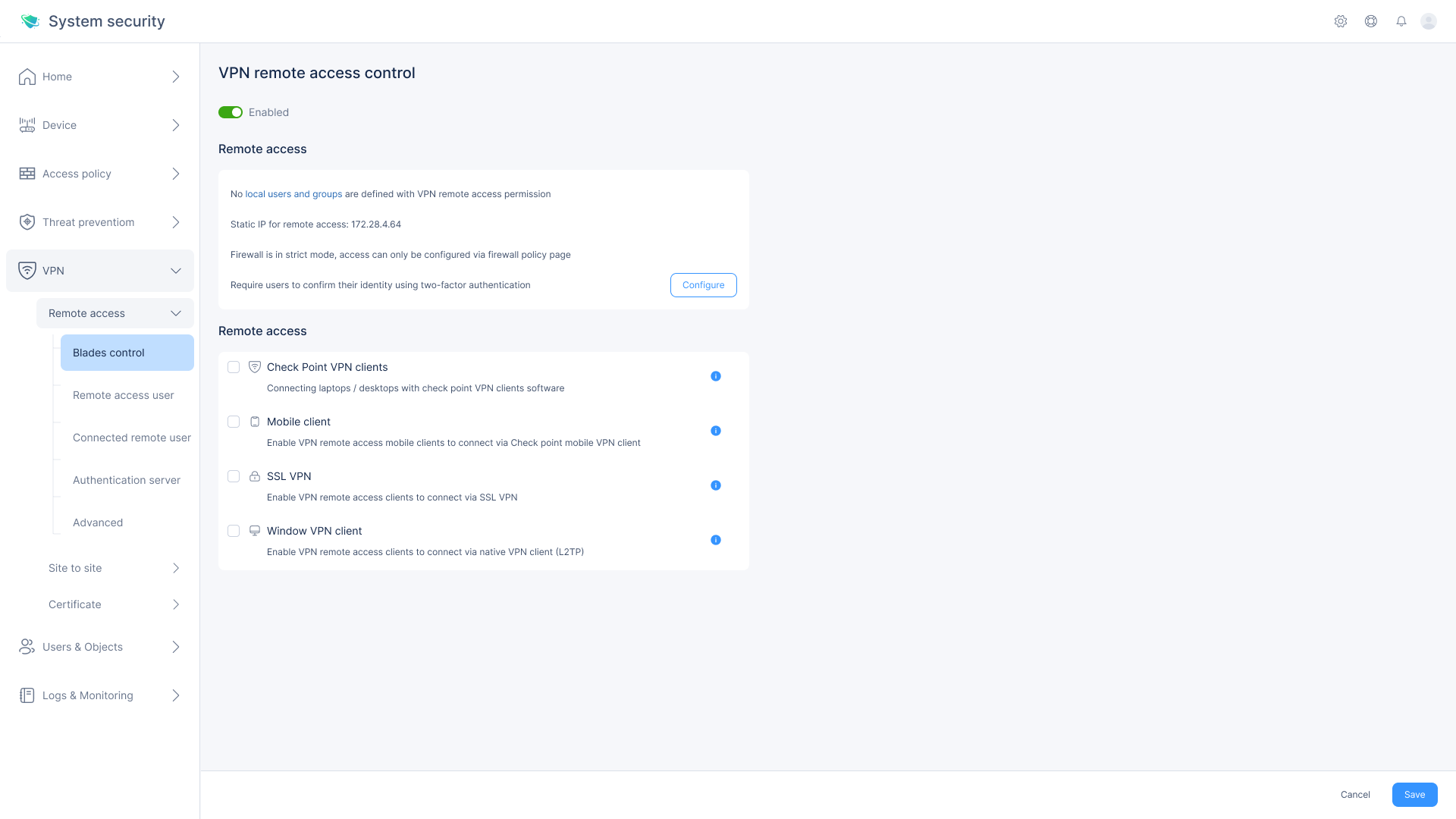 Blades are visually grouped by function—Access Policy, Threat Prevention, and VPN—reducing mental load. - Consistent actions