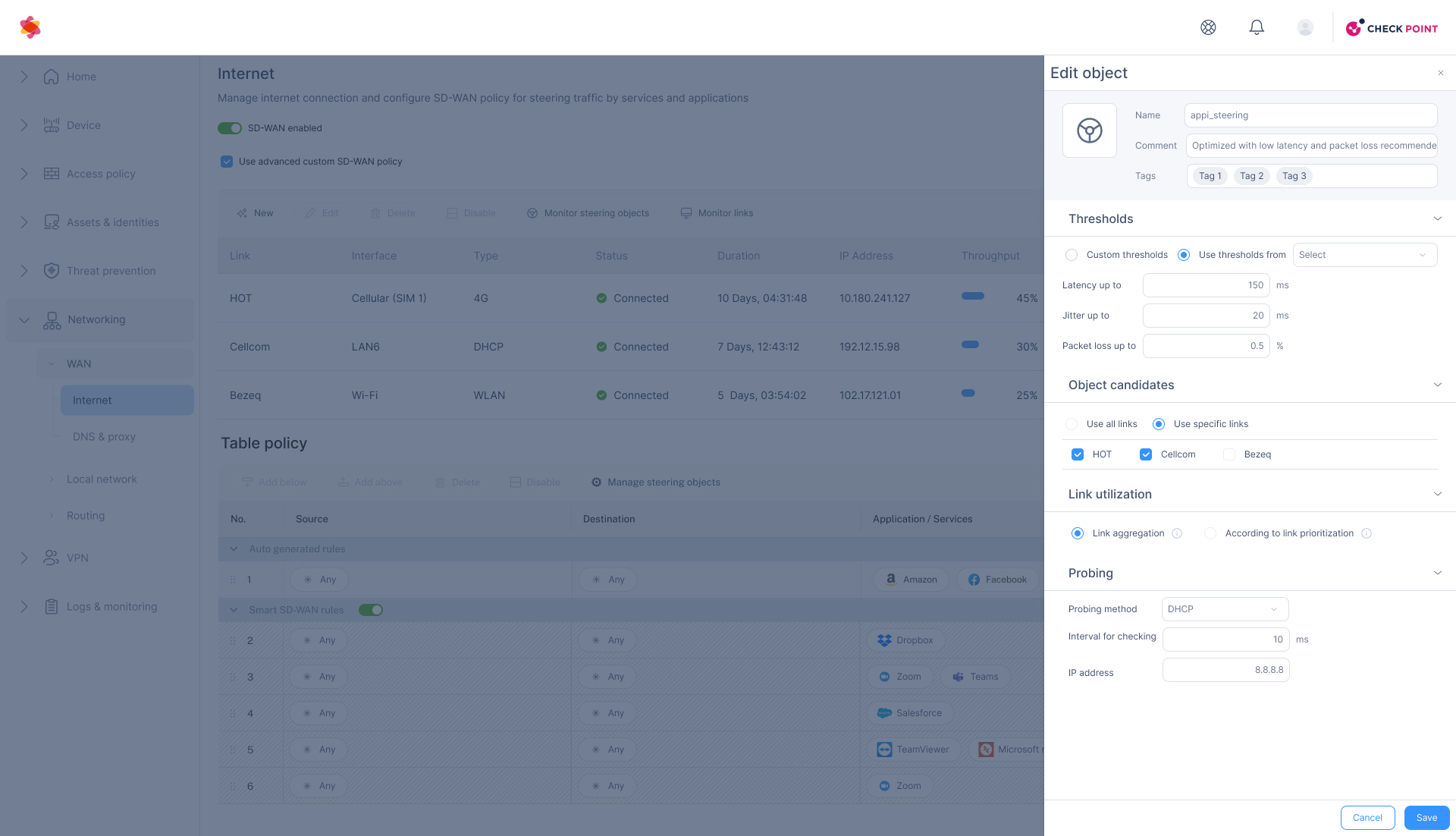 Use-case segmentation (link selection): By allowing the user to pick which interfaces (e.g., HOT, Cellcom, Bezeq) are used for this object, the drawer supports intelligent traffic steering per business priorities. - Save/Cancel CTA placement: Located at the bottom-right for easy access and familiarity, consistent with common UX patterns.