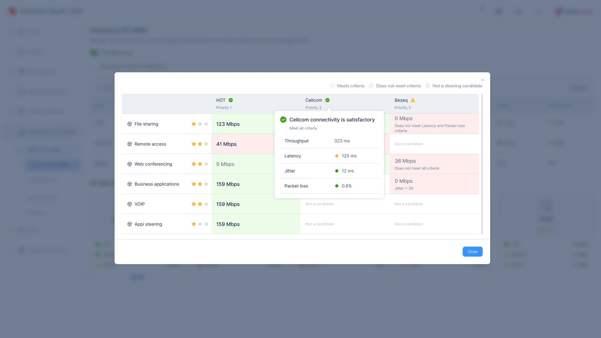 - Priority levels set for different apps (Zoom, Teams, Salesforce, etc.) across network paths.